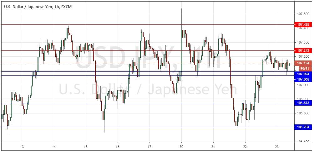 Yesterday’s signals were not triggered as there was no bearish price action when the resistance level identified at 107.10 was first reached.