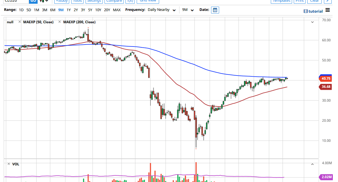 The oil markets like to find some type of $10 range to trade in, and right now I think that is what we are trying to do. The question is whether or not the squeezing of the 50 day EMA and the 200 day EMA will continue to keep this market pressured for very much longer? Typically, this type of squeeze gets resolved with an explosive move, and right now we are trying to figure out what that is going to be. I believe at this point we are likely to see more noise than anything else, so do not be surprised if we simply continue to chop back and forth in a market that really has been horrible to trade as of late. If you are a short-term scalper, perhaps it works but in this environment the prophets have not been easy to come by.