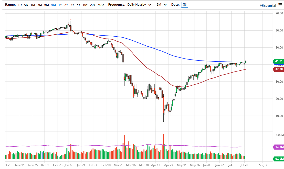 The West Texas Intermediate Crude Oil market has broken above the 200 day EMA during the trading session on Tuesday, as it looks like we are ready to break through the $42 level. This is a market that has been squeezing in general, and therefore think it is likely that we will continue to find value hunters every time we dip, as the market has been in a slow grind to the upside.
