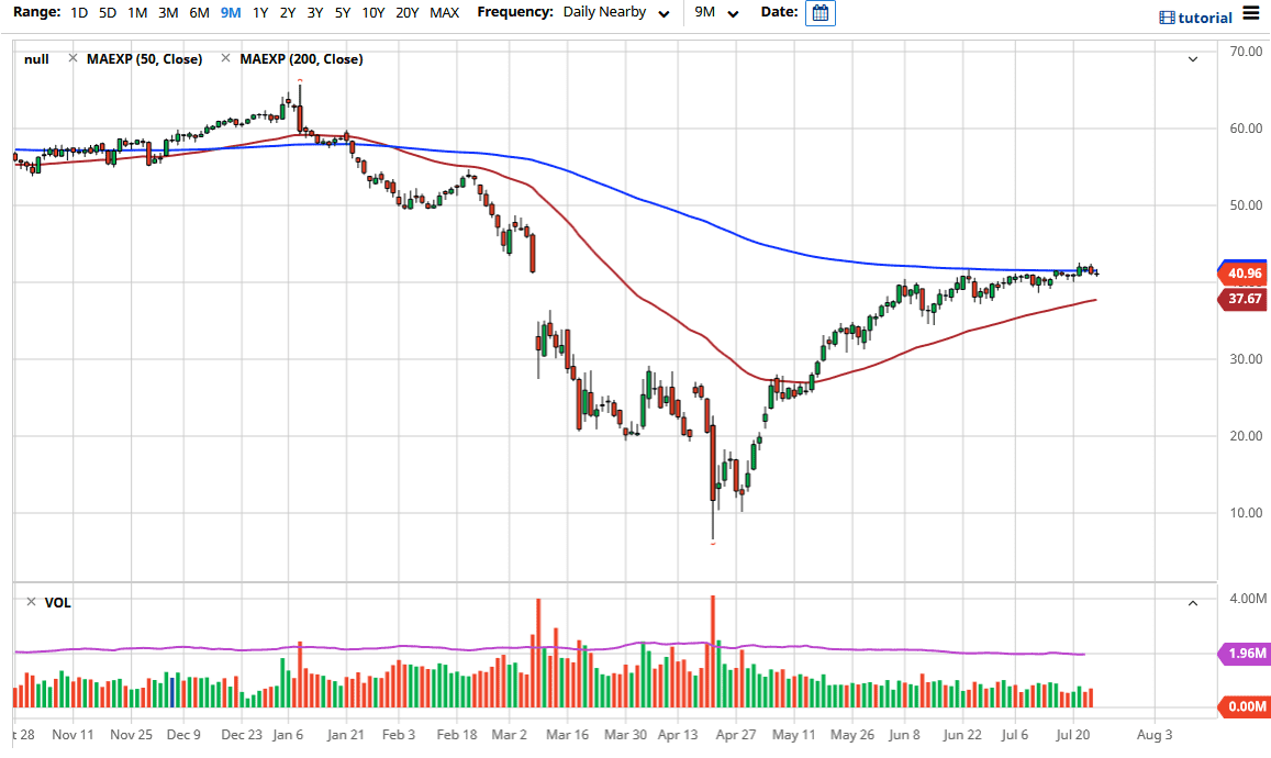 OPEC has been very stringent with its quotas when it comes to production cuts, and unlike many of the other times in the past, it was relatively well followed. This brings down supply but at the same time, we have to worry about demand coming out of the United States. This has now been exacerbated by the fact that the United States and China are heating up the Cold War again, and that could cause serious demand issues also. With that being the case, crude oil has quite a bit of bearish pressure on top of it. However, you can also make an argument that the US dollar falling helps the idea of crude oil going higher, so with just those issues alone, you can see why the market simply has not found itself bullish enough or bearish enough to make a significant move over the last couple of months.