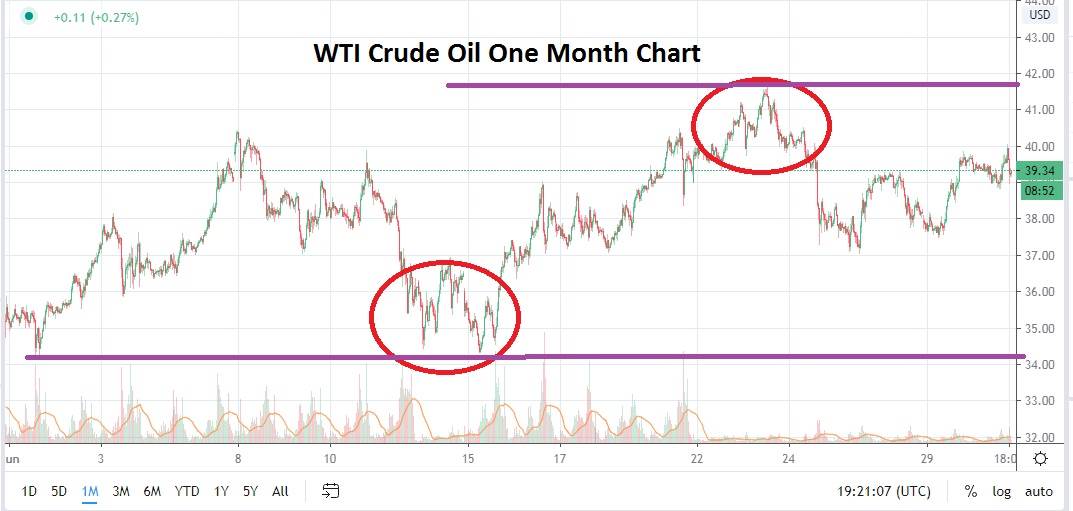 June produced a price range mostly between 34.00 and 40.00 US Dollars a barrel. The commodity appears to be heading into July with enough backers to support a normal trading range too. Questions of supply and demand remain troubling aspects within WTI Crude Oil. However, a foundation has been established which allows speculators to take positions in a manner that allows them to breathe and not worry about a repeat of the death spiral which developed in April, causing professional and retail traders to shake their heads in disbelief.