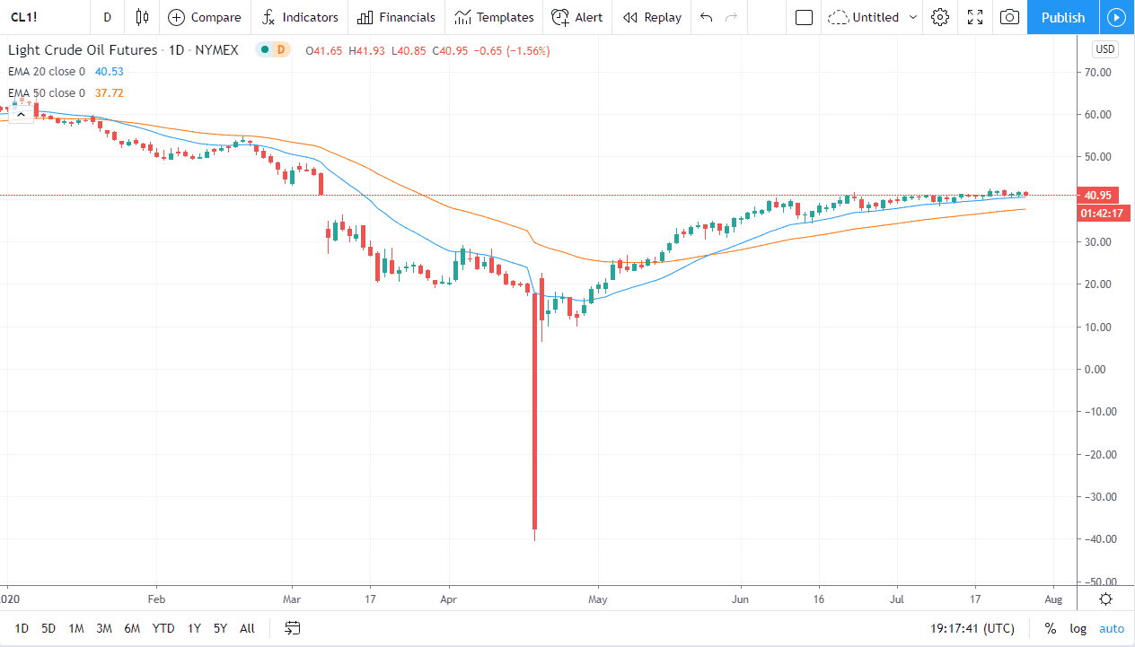 The West Texas Intermediate Crude Oil market dropped a bit during the trading session on Tuesday, as the $41 level has offered a bit of resistance, and the 20 day EMA underneath continues to offer support. At this point in time, the market looks like it is ready to continue to go higher, but we need some type of catalyst. Currently, the biggest catalyst would be the falling US dollar, which in and of itself can be rather helpful when it comes to commodities. Having said that, it is probably not enough for a bigger move to the upside.