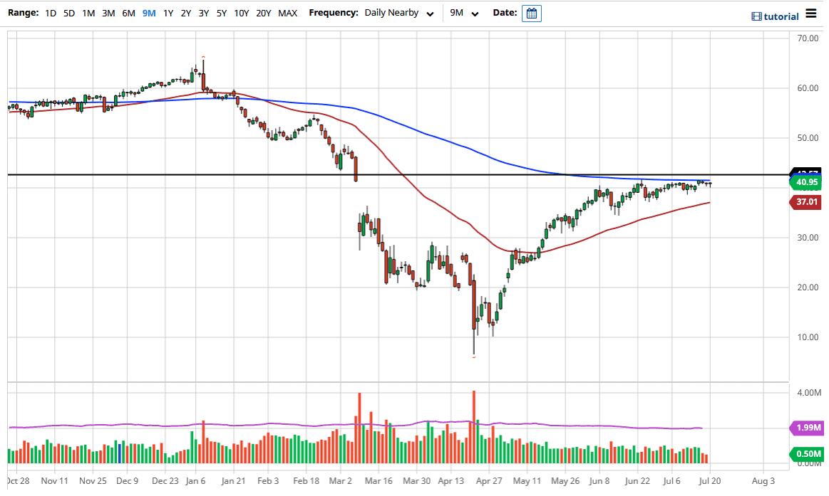 The West Texas Intermediate Crude Oil market initially dropped during the trading session on Monday to kick off the week but has found plenty of support near the $40 level yet again. This is a market that has been very noisy and choppy, but at this point in time, it looks as if we just do not have enough momentum to break out. The 200 day EMA sits just above, and it is likely that we are going to continue to see that technical indicator causes some issues. Having said that, this is a market that continues to see a lot of buyers underneath, and the 50 day EMA at the $37 level also offers a bit of a “floor” in the market as we have had a lot of interest in the 50 day EMA previously.