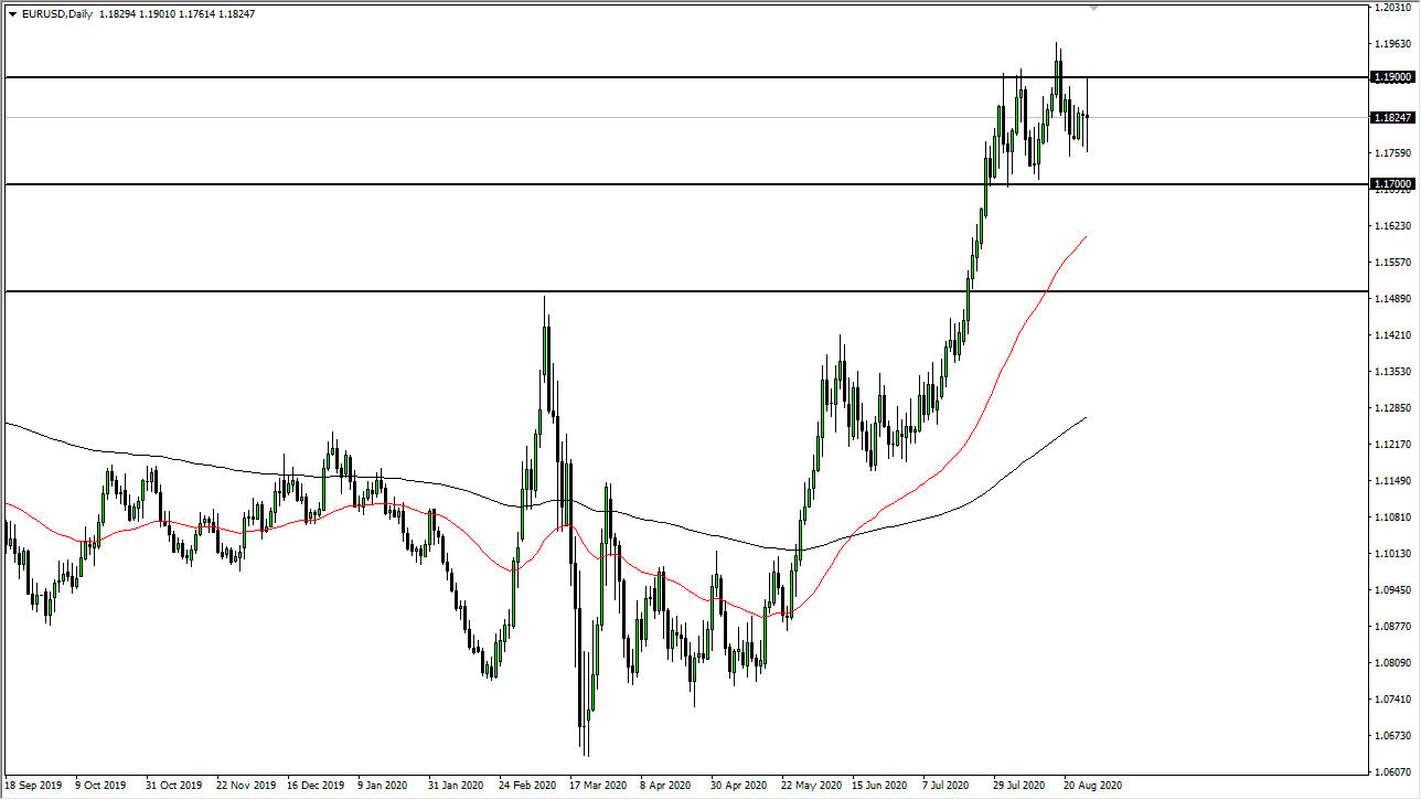 The Euro went back and forth during the trading session on Thursday as Jerome Powell finally had his speech from the Jackson Hole symposium. The market was very confused all day, as we initially rallied all the way towards the 1.19 level, which is a level that has been resistance in the past. We then fell hard to reach down towards the 1.1750 level, before turning around to finish the day somewhat unchanged. At the end of the day, this tells me that the market has not changed much, only took out a lot of traders and stop losses during the day.