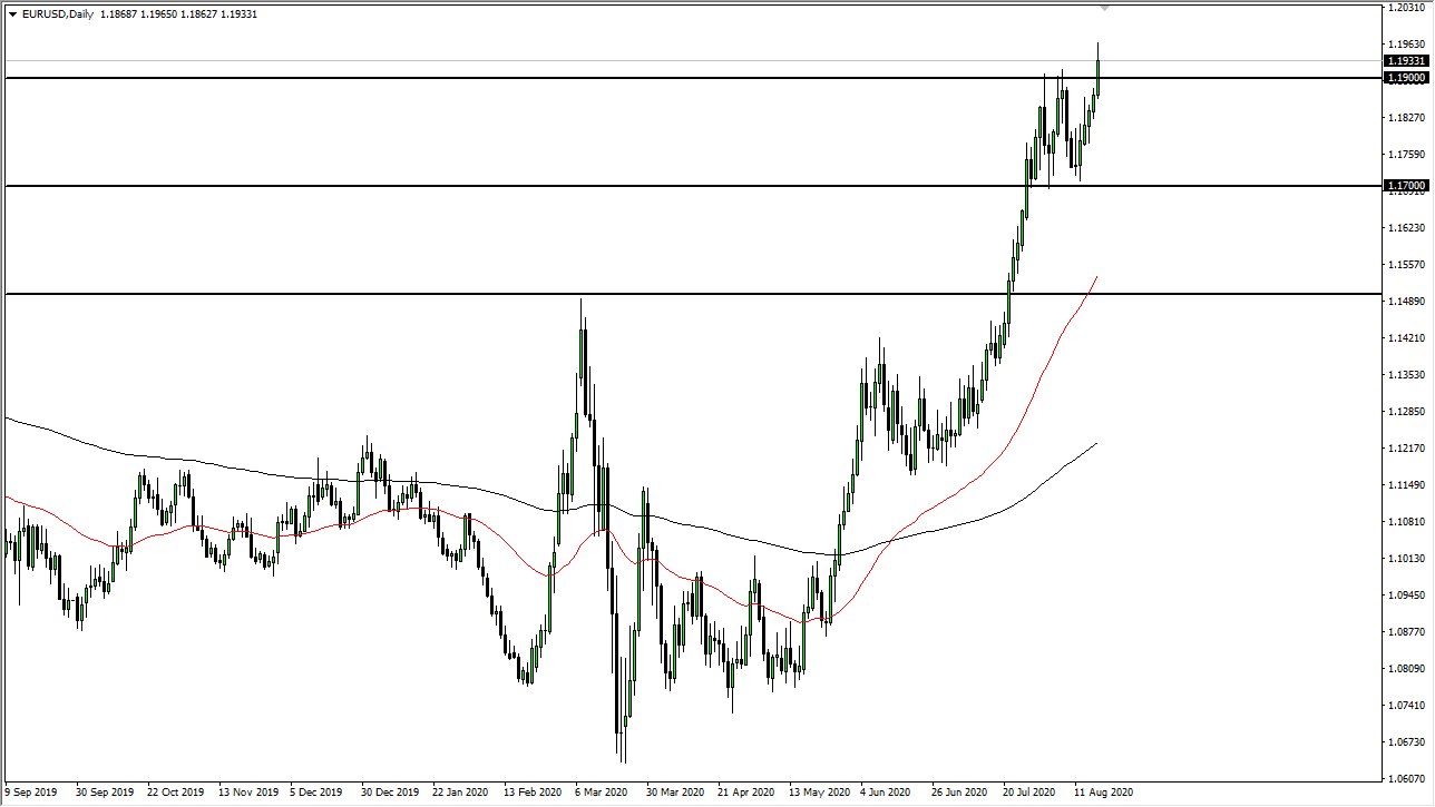 We have already seen this recently, as we reached towards the 1.1350 level and then went sideways. We eventually broke out from that bullish flag and cleared the 1.15 handle, the 1.17 level, and then attempted to break above the 1.19 level, something we just did today. In the short term, we had bounced around between the 1.19 level and the 1.17 level, forming a bit of a flag or rectangle, depending on how you look at it. Either way, this shows that the market is breaking out to the upside.