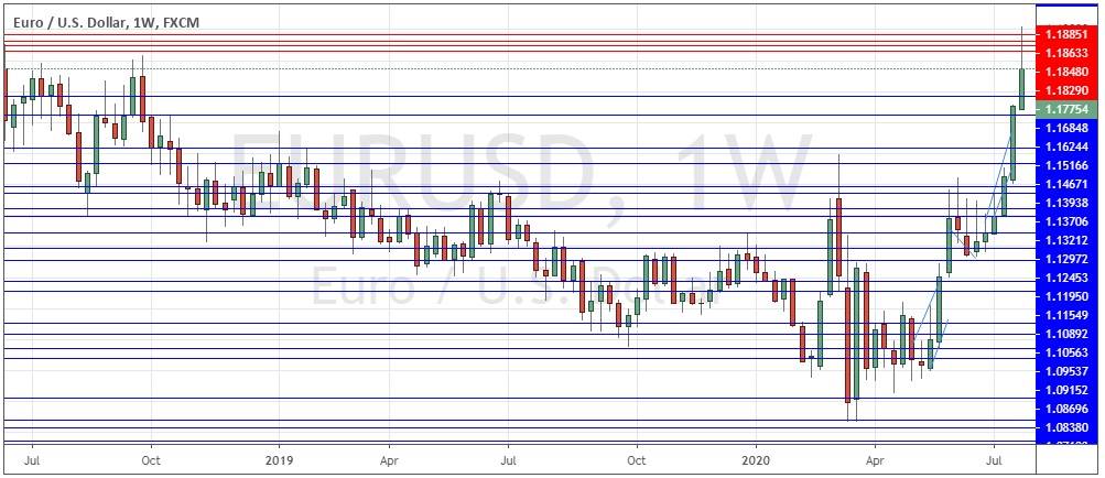 Last week printed a fairly large bullish candlestick, which closed at a new 2-year high weekly closing price. However, the price did close far off the high of its weekly range after peaking early on Friday. These are mostly bullish signs and other currencies have also been advancing against the U.S. Dollar. However, I want to see a daily (New York) close above 1.1847 before going long.