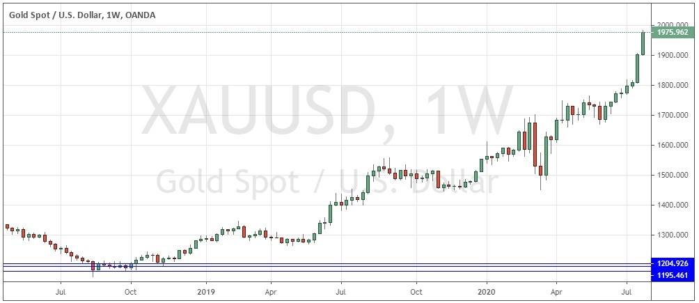 Last week printed a large bullish candlestick which closed at a new all-time high weekly closing price, which is unquestionably a bullish sign. The close is also near the high of the range, which is another bullish sign. The only thing bulls have to worry about here is the proximity to the big round number of $2,000 which might interrupt the “blue sky” the price is currently rising through. I again see that it is time to trade Gold in the long direction, as the signs point to higher prices still over the coming week.