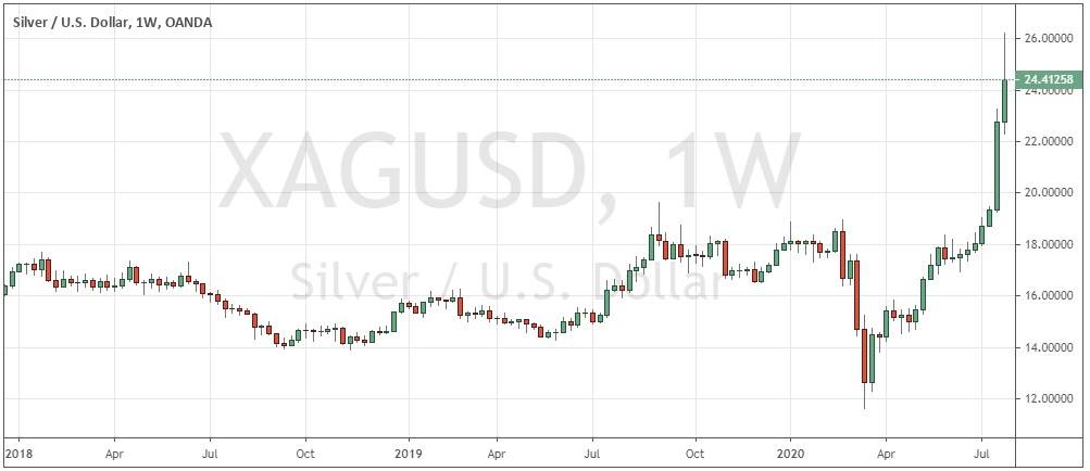 Last week printed a fairly large bullish candlestick, which closed at a new 8-year high weekly closing price. However, the price did close far off the high of its weekly range after peaking on Tuesday. These are mostly bullish signs and other precious metals such as Gold are also advancing against the U.S. Dollar. However, I want to see a daily (New York) close above $24.61 before going long. There is a fairly good chance that the price of Silver will rise over the coming week, but I am more optimistic about Gold.