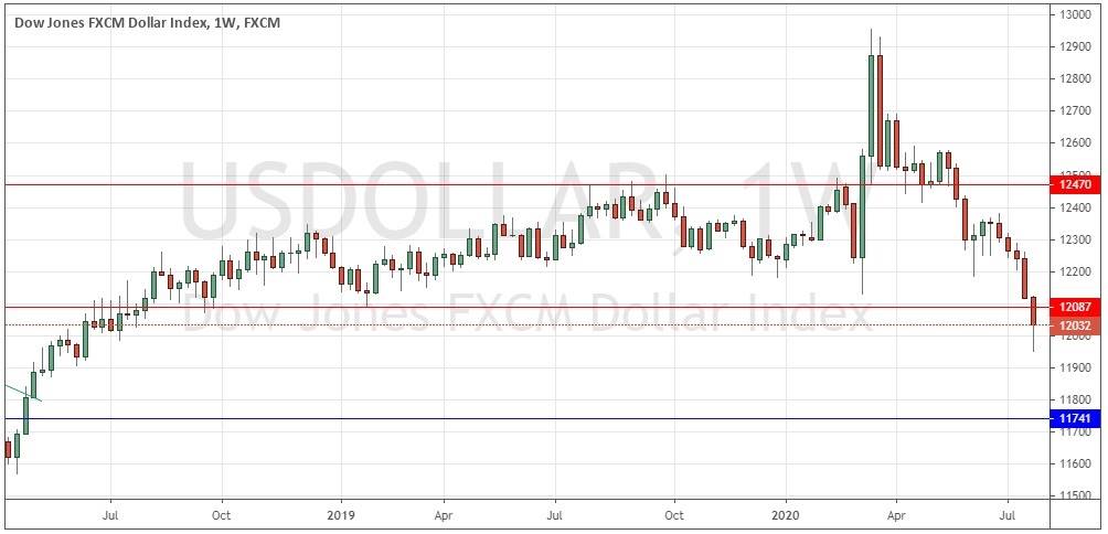 The weekly price chart below shows last week printed a bearish candlestick which made the lowest weekly close seen in over two years, which is a bearish sign. There is finally a long-term bearish trend, as the price is lower than it was both 3 and 6 months ago. The only problem for bears is that although the price has broken below the 12087 area which has provided support since early 2019, we see a significant lower wick which was formed by a fairly strong reversal on the last day of last week, meaning a retracement may now happen in favor of the Dollar as the market opens next week. Overall, next week’s price movement in the U.S. Dollar looks more likely to be downwards than upwards.