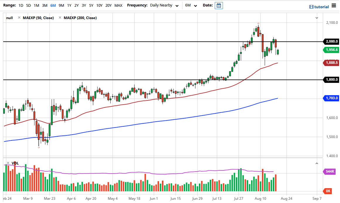 I also recognize that the $2000 level does offer a certain amount of psychological significance to it as well, so having said that it makes quite a bit of sense that we could see the market try to get there, and then perhaps grind back and forth from that level. Longer-term, I think that we do make fresh highs, because we certainly have a lot of things out there that could drive gold higher, not the least of which is all of the quantitative easing. Beyond that, we also have a lot of concern out there when it comes to global growth. The coronavirus situation also continues to cause havoc in the world to cause a bit of demand for safety as well. Beyond that, we also have central banks around the world buying gold as quickly as they can as well, offering a bit of a support level. At this point in time, I continue to buy dips although the last couple of big red candle certainly have been a shot across the bow of buyers.