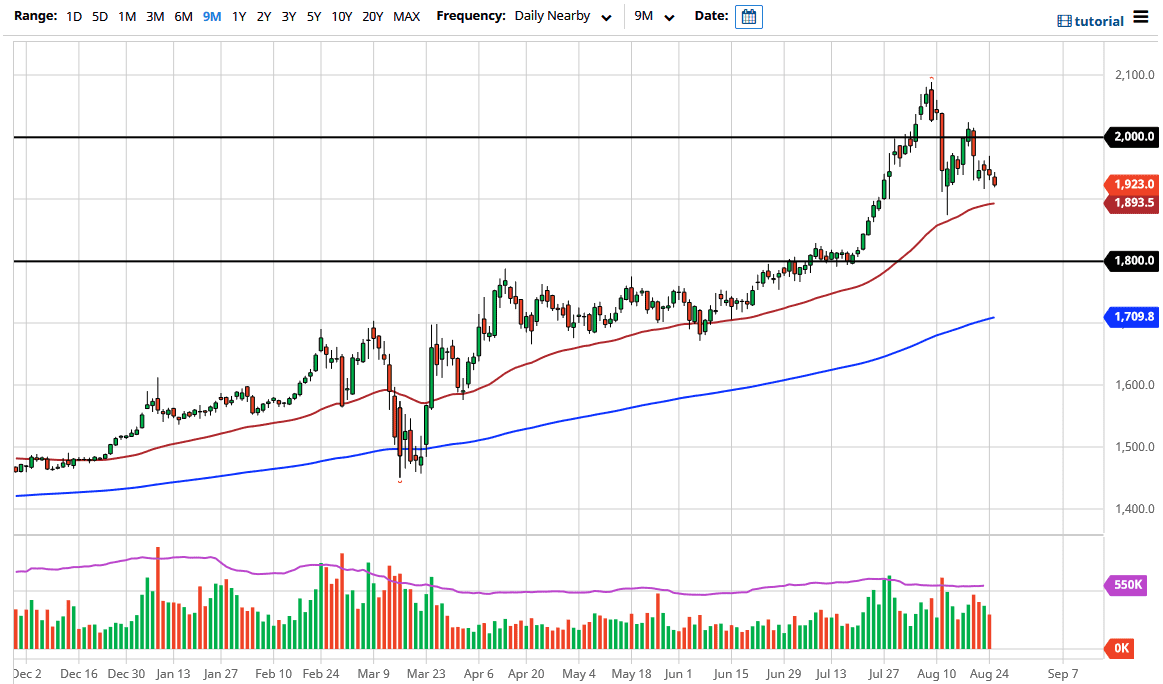 As long as the US dollar continues to lose value, the gold market will continue to go higher. The 50 day EMA is just underneath at the $1893 level, sitting just below the psychologically and structurally important $1900 level. The 50 day EMA is of course a technical analysis signal that a lot of longer-term traders will pay attention to and does tend to cause a bit of reaction in this market. If we can get a bounce from the $1900 level, then it is likely that we could go towards the $2000 level. On the other hand, if we were to break down below the 50 day EMA then I think we are going to go looking towards what I think is the “absolute value area” that is worth paying attention to, the $1800 level. That is an area that we had broken out of previously and has not been tested since. Yes, we have seen the area offer support just after breaking above it, but I think it does make sense that we go lower to find more buyers.