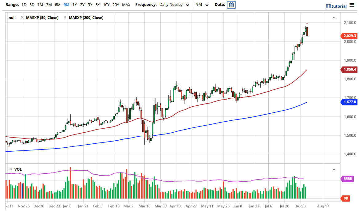 Keep in mind that the value of the US dollar continues to get hammered, so that has been the main driver of gold going higher. The Federal Reserve continues to print US dollars, thereby devaluing the currency. The gold market is priced in US dollars, and therefore it makes sense that we would continue to see the commodity rise. In fact, we have seen several commodities rise in value, and that should continue to be the case going forward. Nonetheless, markets cannot go straight up in the air forever, be it gold, oil, or anything else. With that, I think that a healthy pullback is coming and there are plenty of people out there that would be more than willing to pick up value if it shows up.