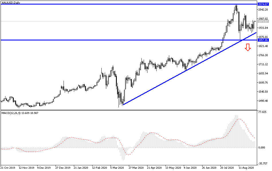 After the expected announcement by Federal Reserve Governor Jerome Powell of important adjustments to the bank’s monetary policy in the era of the COVID-19 pandemic, the effects of which outweighed the global financial crisis during 2008-2009, the US dollar reaped strong gains that contributed to the drop in gold prices to the support at $1910 dollars an ounce. The markets believed that this decline would not last for long, as the US dollar quickly declined strongly with the market’s absorbing what Jerome Powell announced. Accordingly, gold prices had a better chance to move up to the $1974 resistance before closing the week’s trading around the $1965 level per ounce. Renewed tensions between the United States of America and China were an additional feat for the yellow metal.