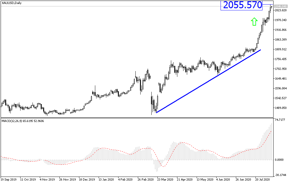 Gold price performance broke all accepted trading rules and analysis. Despite the beginning of the gold price correction movements since mid-March, starting from the $1460 an ounce, the yellow metal has been continuously harvesting gains ever since, until it was capped by testing the $2055 an ounce, the highest level in the history of gold. It settled around the $2035 an ounce at the time of writing. The metal was indifferent to the technical indicators reaching sharp overbought areas and remained adhering to its record gains, as the rules are that the arrival of prices to such a situation is followed by profit-taking sell-offs, which has not happened with gold yet. Yes, gaining factors still exist, but usually selling operations occur and push gold back to new support areas to form a base to complete the launch to the top.