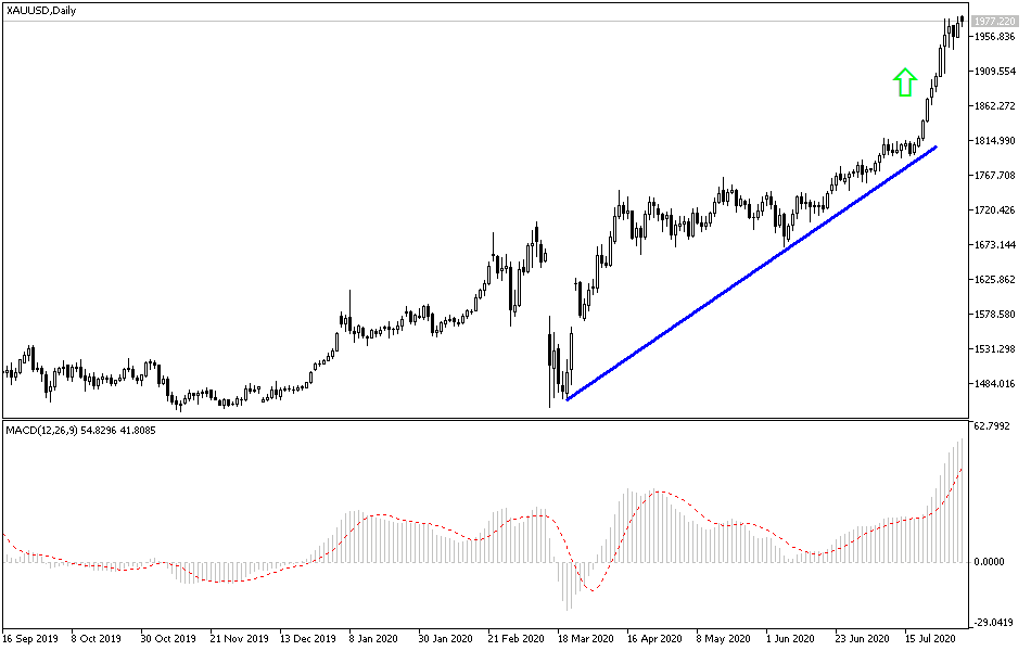 Yellow metal bulls succeeded in pushing the price of an ounce of gold towards the $1983 resistance, its highest level in history. With a limited uprising of the US dollar after its recent collapse, gold price fell to $1960, an ounce before closing trading around $1975 dollars. The yellow metal is still supported by the COVID-19 impact on the global economy, the decline in the US currency, and tensions between the two largest economies in the world. The uncertainty that dominates the global financial markets due to the negative economic effects of COVID-19 will support gold for a longer period. There are strong indications for the start of the second coronavirus wave, and the United States of America is still the world leader in cases and deaths from this deadly disease.
