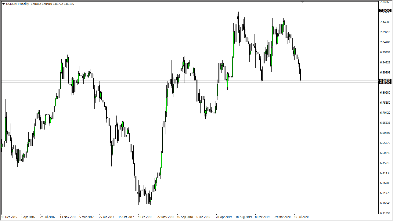 The US dollar has fallen rather hard against the Chinese Yuan, in a major “risk-on” type of move. At this point, it looks as if the 6.85 level offer support, but if we break down below there we should continue to see this market drop, and while many of you will not trade this market, it will show that the US dollar should follow against most other currencies and you can apply that knowledge as a secondary indicator in other pairs such as the EUR/USD, AUD/USD, USD/CAD, and so on.