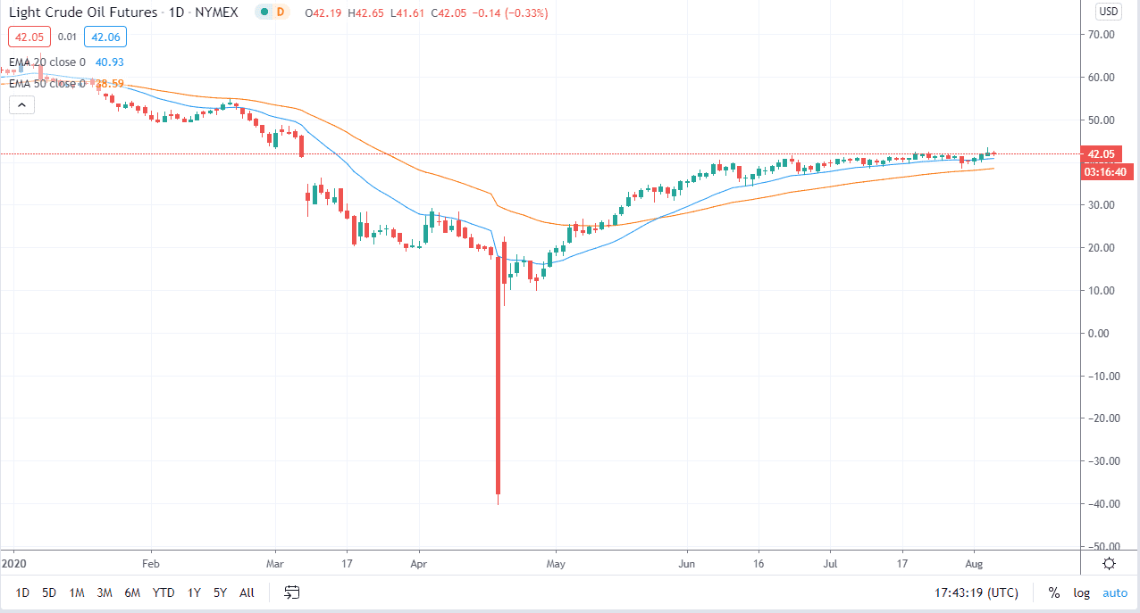 The US dollar falling has been a major driver of the crude oil markets rallying, because people are buying commodities instead of holding onto fiat currency which is currently falling apart. That being said, we also have to worry about the overall consumption of crude oil and whether or not people are actually going to use it. Right now, that seems to be very unlikely but at this point anything is possible. The economic recovery is slow to say the least, so I think that demand will continue to be a major problem. Ultimately, if we can break out to the upside, we will probably run into the $49.00 level which is significant resistance. That resistance extends to the $50 level, so you will need to pay close attention to that area if we do get up there.