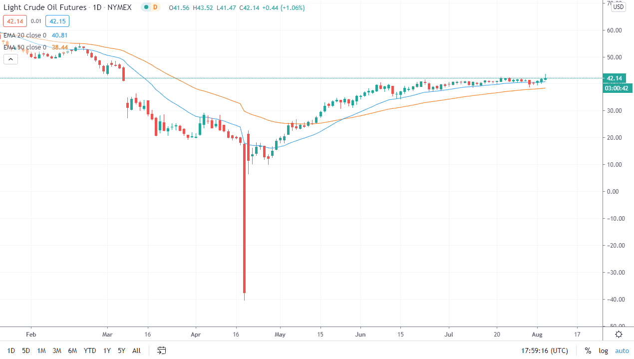 Underneath we have the 20 day EMA offering support, and then after that, we have a significant amount of support at the 50 day EMA. There is probably a bit of a “zone of support” between the two, so at this point, I do not have any interest in trying to short this market. That will continue to be the case with this market because of the US dollar falling apart which continues to lift all commodities, not just this one. As far shorting is concerned, if we break down below the $30 level, I would be interested but we are light years away from that happening so I think that eventually we will test that major sell-off near the $49 level.