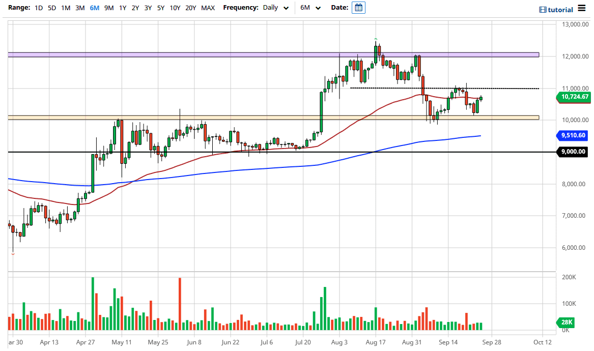All things being equal, I think we are going to go back and forth, and therefore short-term traders will probably continue to dominate the market. If you have the ability to trade with decent spreads, then you probably get the opportunity to move back and forth rather quickly. This suggests that you could make a little bit of money, especially over the weekend but at this point the $10,000 level looks to be rather significant support. Even if we were to break down below there, the 200 day EMA sits at the $9500 level, and then the $9000 level. If we were to break down below the $9000 level, the Bitcoin market will fall apart. Until then, one has to assume that we continue to step back and forth in these increments that I have marked on the chart, as Bitcoin typically will do. It is all about the US dollar at this point, despite the fact that most Bitcoin traders ignore that.