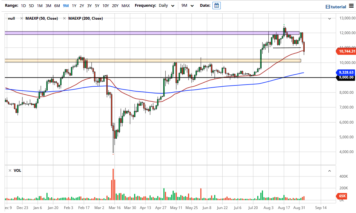 When you look at the area that we just broke out of, you can make an argument for a head and shoulders pattern, which essentially measures for a move down to $10,000 anyway. That being the case, I like the idea of buying short-term pullbacks, but you would need to be very cautious about your position size as the volatility is probably going to increase, not shorting. Keep in mind that the jobs number comes out on Friday, and that will influence the US dollar. By extension, that is half of this currency pair, so obviously you have to pay attention to what is going on with that part of it. That being said, this is a very negative looking candlestick and I do think it makes quite a bit of sense that we drift a little bit lower heading into the Non-Farm Payroll figures come out at 830 in the morning New York time Friday.