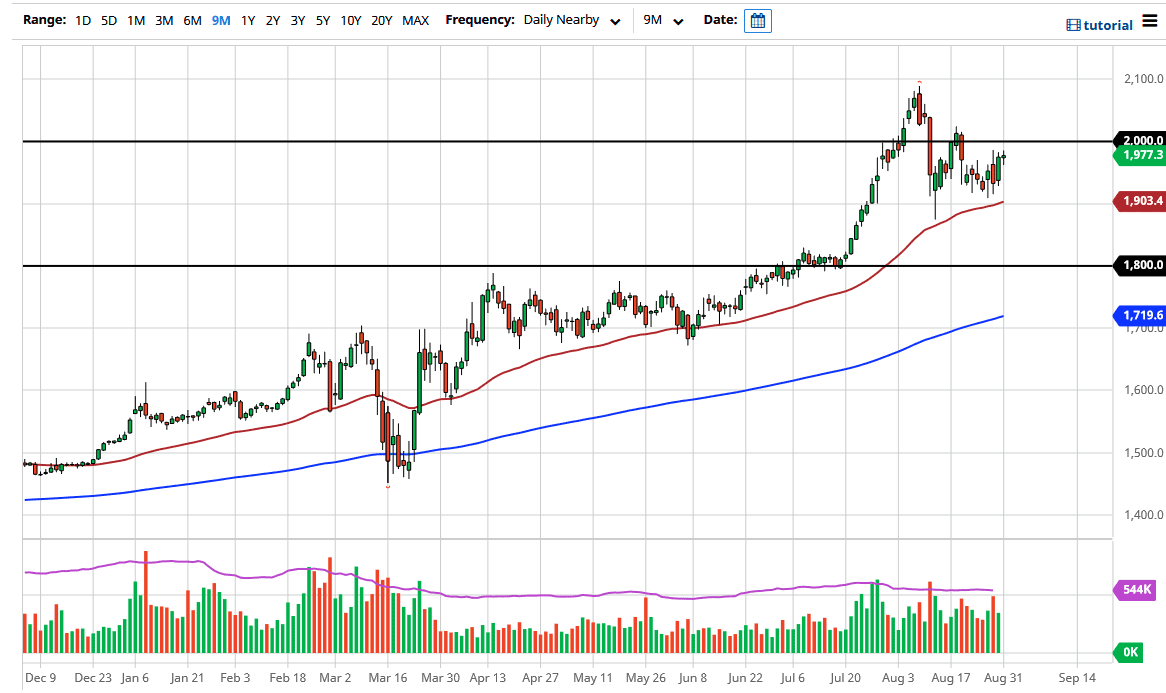 Buying dips at this point continues to be a strategically something to do, especially with the $1900 level underneath offer and so much in the way of support. The 50 day EMA sits there, and of course is a large, round, psychologically significant figure. Furthermore, even if we do break down through all of that, there should be even more support closer to the $1800 level because it was so structurally crucial previously. The 200 day EMA is trying to get towards the $1800 level, and if it does before price gets there, then it will become much more supportive as well.
