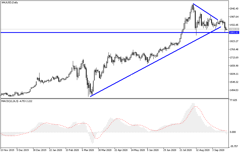 The bearish momentum for the gold price is still the strongest in light of the strong buying operations of the US dollar, which moves inversely with the path of gold prices. The price of gold fell to $1882 an ounce, its lowest in two months ago. Yesterday, it tried to rebound higher, but its gains did not exceed $1920 an ounce before it returned to stability around the $1900 an ounce at the beginning of today's trading, which contains more important economic issues affecting the morale of investors and financial markets. What stopped the losses of gold was the concern about the strength of the second COVID-19 wave, which threatens to restart the global economic activity lockdown again.