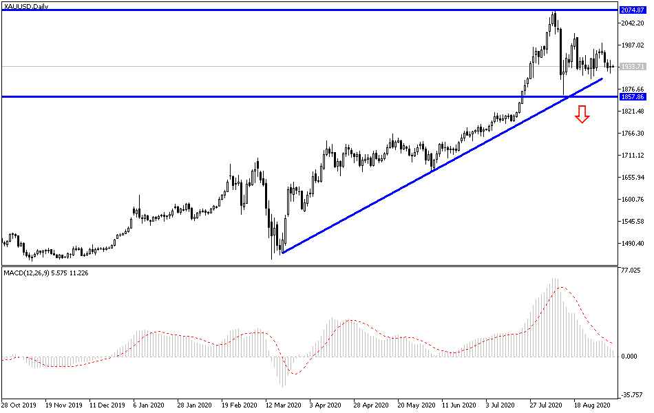 In the last three trading sessions last week, gold prices retreated to $1916 an ounce, after a strong attempt by the bulls to push the price towards the level of $2000 psychological resistance at the beginning of the week's trading. Losses were supported by selling as the US dollar recovered, and investor risk appetite improved. The price of gold stabilized around $1937 per ounce at the beginning of this week's trading, as factors of gains still exist, global geopolitical tensions still exist. The human and economic losses from the COVID-19 outbreak are still continuing with the winter season approaching without a vaccine that eliminates the deadly disease, the plight of the global economy will increase, which in the first wave of the outbreak was exposed to the largest recession since World War II.