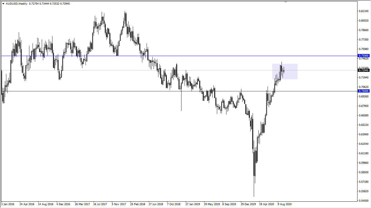 The Australian dollar has rallied a bit against the US dollar during the trading week as the market broke above the 0.73 handle, showing signs of bullish pressure before rolling right back over. At this point, I believe that we are essentially forming a trading range due to the fact that we had formed a hammer during the previous week, only to form a shooting star this past week. In other words, we are going back and forth trying to kill time. Look at the 0.72 level as a potential support level, as the 0.74 level will be a potential point in time, the market is likely to simply bounce around in that area going forward.