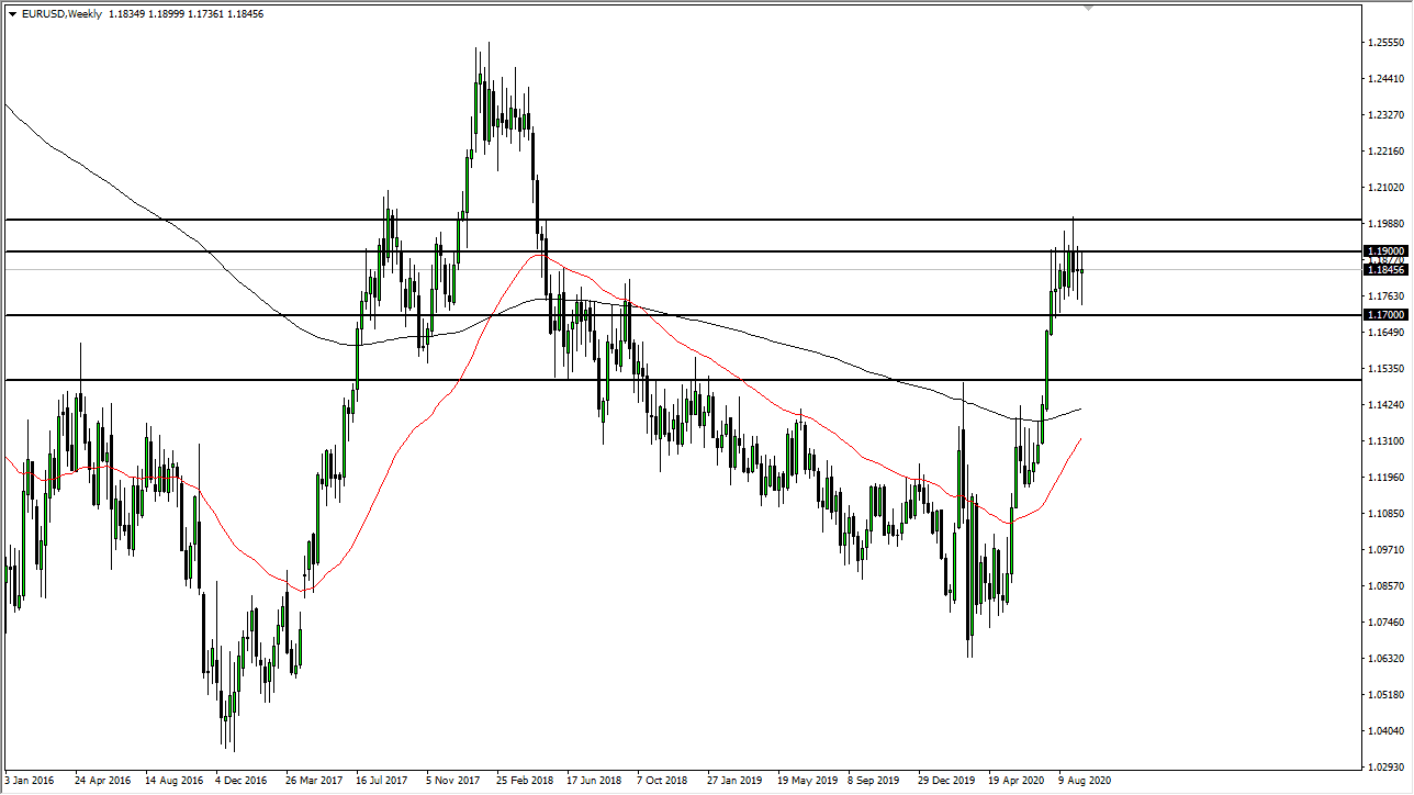 The Euro has gone back and forth during the course of the week, testing the 1.17 level underneath, and the 1.19 level above. Just as we did during the previous week, the market ended up forming a very neutral candlestick and this shows that we probably do not have anywhere to be for a while. Having said that, I believe that the market probably finds itself running out of momentum, and that of course is something to pay attention to. It is not until we break above the 1.20 level that the market would be free to go much higher. Look for range-bound trading.
