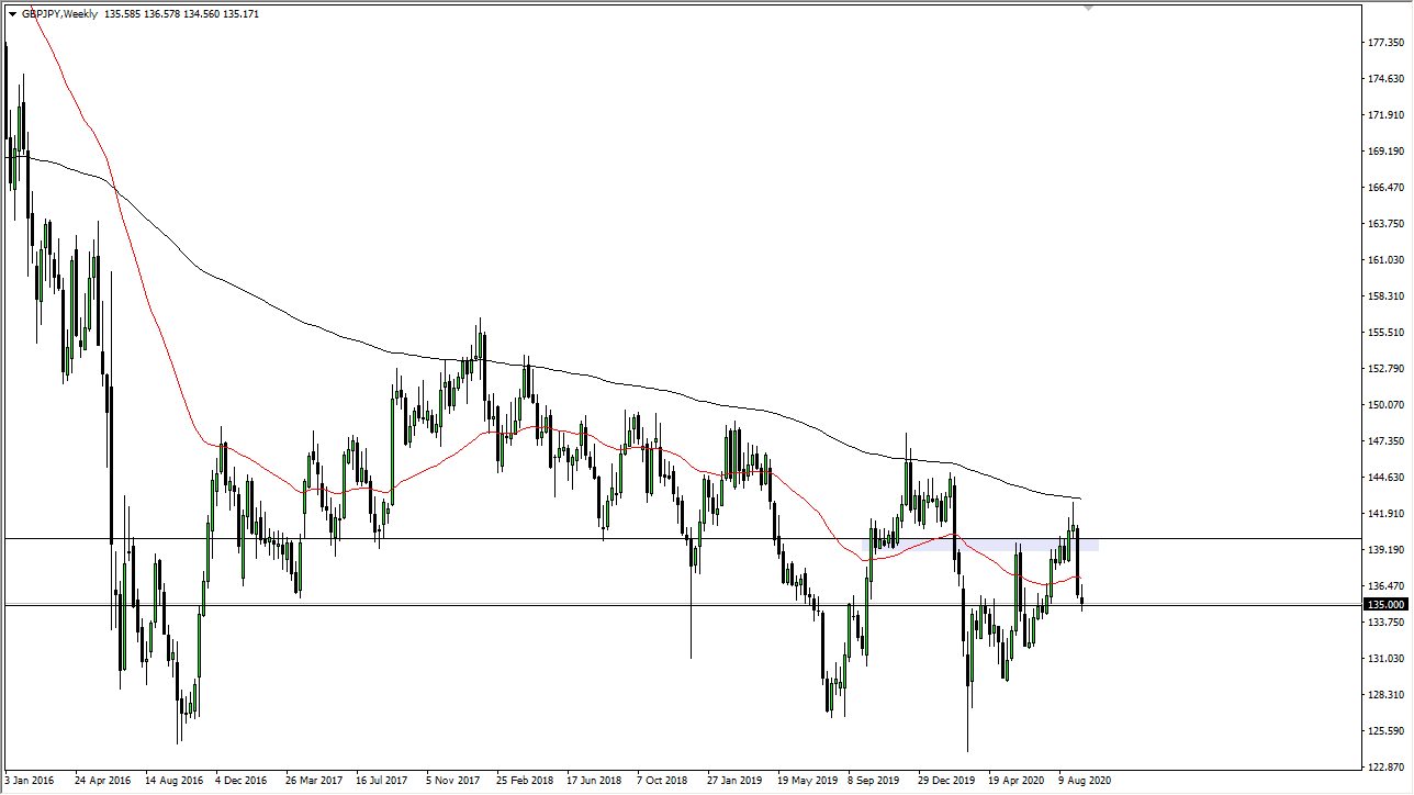 The British pound has gone back and forth during the bulk of the week against the Japanese yen, and quite frankly I think this is indicative of just how important area that we currently trading at is. The ¥135 level is a large, round, psychologically significant figure, and an area where we had seen resistance previously. With that in mind, I think it is going to be a very choppy week but follow whatever direction the market breaks out of this candlestick as it should lead for a move of at least 100 pips.