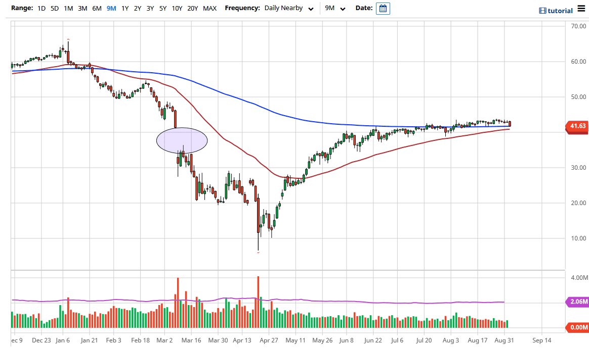 The West Texas Intermediate Crude Oil market has fallen rather hard during the trading session on Wednesday, as the EIA report came out bullish. More importantly, we have reported that Iraq is looking to get out of the production cuts for OPEC plus. That could bring more production into the markets, and if that is the case it is likely that we will reach much lower. The 50 day EMA underneath suggests that there could be support in that area, but if we break down below the $40 level that could seem like a much more significant move, and therefore it is likely that we go much lower. At this point, the $35 level would be a target, perhaps even as low as the $30 level.