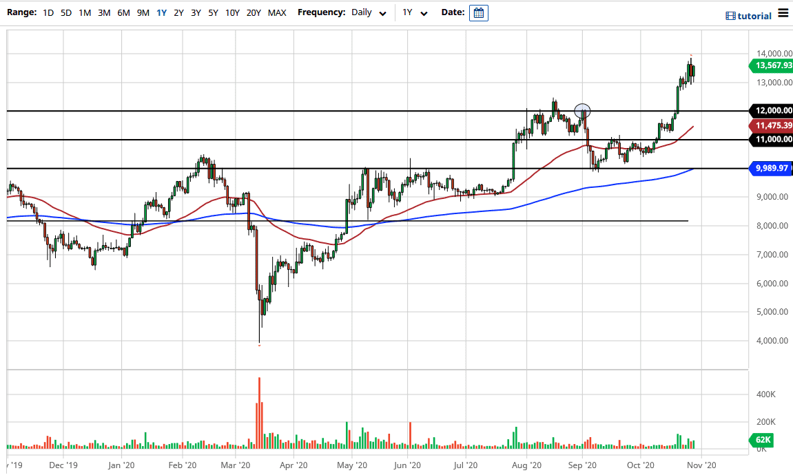 To the upside, I see the $14,000 level as a significant resistance barrier, but one that I believe eventually gets broken above. When you look at the chart, it is very easy to see that the market does tend to move in $1000 increments, so the fact that the $1400 level has offered a bit of resistance should not be a huge surprise. Looking at this chart, I think that it is obvious that selling would be a great way to lose money, and I do think that Bitcoin will continue to see a lot of people flooding into it. Bitcoin is starting to make headlines again, so that brings in a lot of retail money. However, at this point it makes quite a bit of sense that we will eventually find a reason for Bitcoin to pull back rather sharply, as it typically will do. I do believe that the $15,000 level is going to be difficult to overcome, simply from a psychological standpoint, but I also look at it as the longer-term target from what I see.