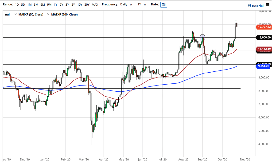 At this point in time it is likely that we will drop a bit from this overextended attitude, as the market had gotten parabolic. The $13,000 level course attracts a certain amount of attention, but you are very cognizant by now that the market does tend to move in $1000 increments, so it is not a huge surprise that we would pull back a little bit from here. I think we need to digest a lot of the gains, so the question is whether or not we go sideways, or do we get a bit of a pullback that we can take advantage of?