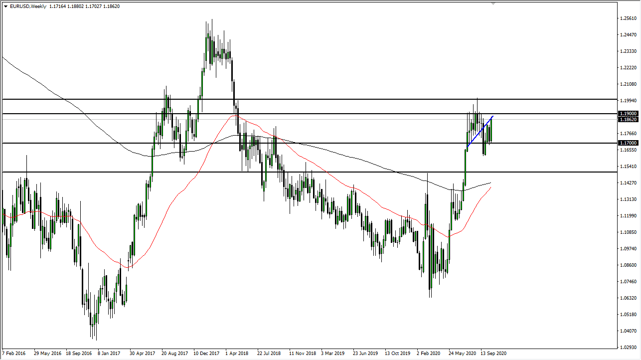 Looking at this chart, I see a lot of support underneath near the 1.17 level as well. At this point in time, I think that we are simply moving back and forth based upon stimulus and of course the horror of the US election. I think that we continue to see a lot of volatility because of that, and the fact that the European Union economic numbers continue to look rather soft, so it is difficult to get overly decisive at this point. In fact, it is probably not until we get to the end of the month that you can make a serious decision, so I think the interim is probably going to see the default scenario of back and forth more than anything else.