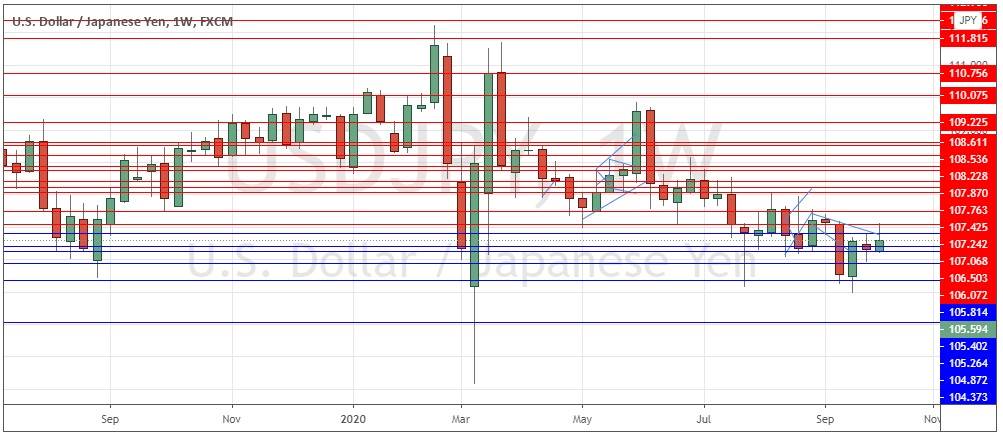 The USD/JPY currency pair is in a long-term downwards trend but rose slightly last week, albeit with a weakly bullish candlestick with a large upper wick. The Dollar itself is in a downwards trend yet few currencies currently look strong against it. The bearish trend here is slow but persistent. A further fall over the coming week is more likely than not to happen. The problem with shorting the U.S. Dollar against other currencies right now is that there are few strong currencies that are not close to firm long-term resistance or support levels which may well block further strong movement in the near term.
