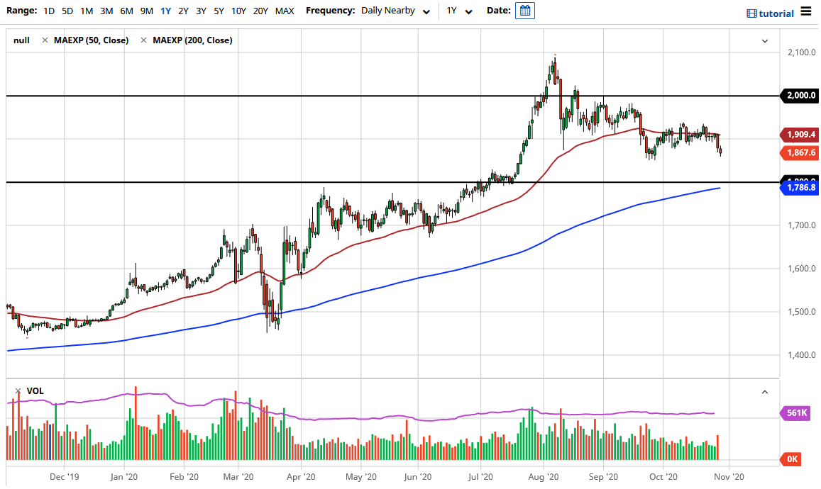 Looking at this chart, the $1850 level of course is an area where we had seen a bounce previously, so it makes sense that we would show signs of support. However, I also believe that there is even more support at the $1800 level, which is an area where we had seen a major breakout previously. That being said, the market is likely to see a lot of interest in that area, not only due to the fact that we had broken above there, but the fact that the 200 day EMA sits just below there as well. In other words, I think a lot of people who have missed the entire move higher would be very interested in trading in this area.