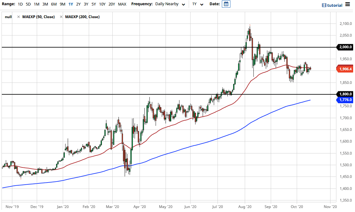 Gold markets have initially tried to rally during the trading session on Friday but gave back the gains above the 50 day EMA. The market still has shown a bit of support though, especially at the $1900 level. Ultimately, this is a market that I think continues to see a lot of sideways trading in general, and due to the fact that the 50 day EMA is so flat, we have so many different things happening at the same time that could come in and cause issues and perhaps more importantly, caution.