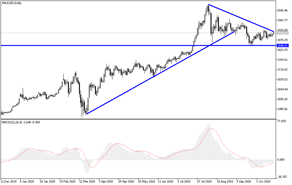 Since the beginning of this week’s trading, gold prices have been trying to rebound higher. The opportunity was enhanced with the dollar's decline that the price of gold rose to $1920 an ounce at the time of writing. As we expected earlier, the opportunity is better for the yellow metal to rise due to several factors, most notably the beginning of the second wave of the Corona pandemic and the subsequent imposition of strict restrictions to contain the outbreak, which has infected more than 40 million person around the world. With advanced economies having the lion's share of that, placing pressure on the global economy as a whole. This is in addition to Brexit negotiations between the European Union and Britain reaching a dead end. It should also be noted that the future of the US presidential elections has a strong and direct impact on the US dollar and thus on the price of gold.
