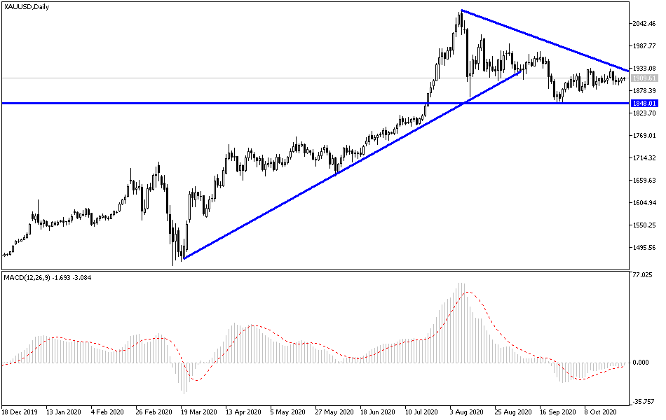 The flight from risk was ideal for the price of gold to move higher and reach $1911 an ounce at the time of writing. The price of the yellow metal is moving in a very limited range in a moment of price explosion in one of the two directions. Gold expectations hinge on hopes for a fiscal stimulus deal and the corresponding swings in real returns. Accordingly, gold prices may continue to fluctuate as the uncertainty surrounding the financial incentives and the Coronavirus persists. Gold price movement fluctuated in the 2% range during the recent trading sessions, as the gold price continues to search for a bullish catalyst in order to make a strong and real breakout. At the same time, with the current uncertainty surrounding the fiscal stimulus talks, gold prices may continue to move in a limited range.