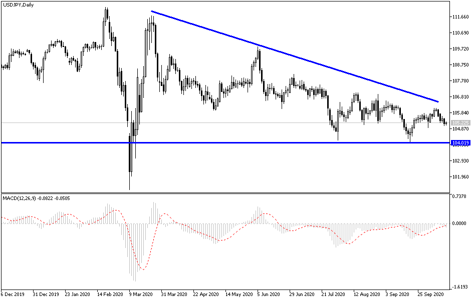 The USD/JPY continued in the downward correction, and losses reached the support level at 105.03 before stabilizing around 105.15 at the beginning of trading on Thursday. What supported risk aversion was the return of the economic shutdown policy to contain a new Coronavirus spread and the international pharmaceutical companies' cessation of their experiments to produce a long-awaited vaccine, in addition to the anxiety that dominates the future of Brexit and the suspension of stimulus efforts to relief the US economy.
