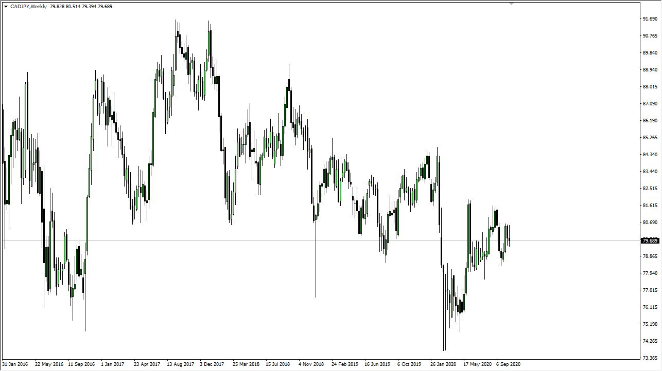 The Canadian dollar has been all over the place during the week, forming a bit of a negative candlestick by the time we will finish. At this point, I think we do see negative pressure going forward and there are a lot of concerns when it comes to crude oil. If crude oil gets hammered, or if we get a “risk-off” type of attitude, the CAD/JPY pair could very well find itself reaching towards the ¥78 level during the week. If we break out to the upside, I think there is a bit of a lid on this market near the ¥81.50 level.