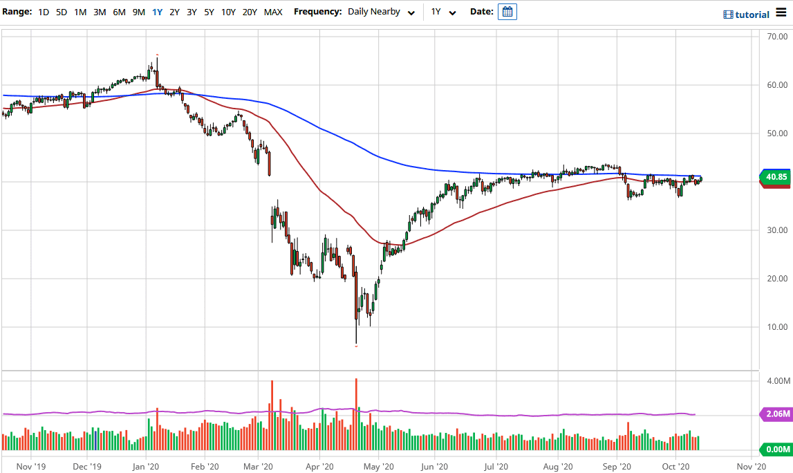 Through that prism, I am looking at this market as one that continues to see a lot of sideways action due to the fact that we just do not have any type of clarity. The 50 and 200 day EMA indicators remain flat, and as we sit around the $40 level, I think we are simply going back and forth in order to try to find a reason to move. Keep in mind that the contract is priced in US dollars, so you will have to pay close attention to what is going on with the greenback in order to get an idea as to where this market goes.