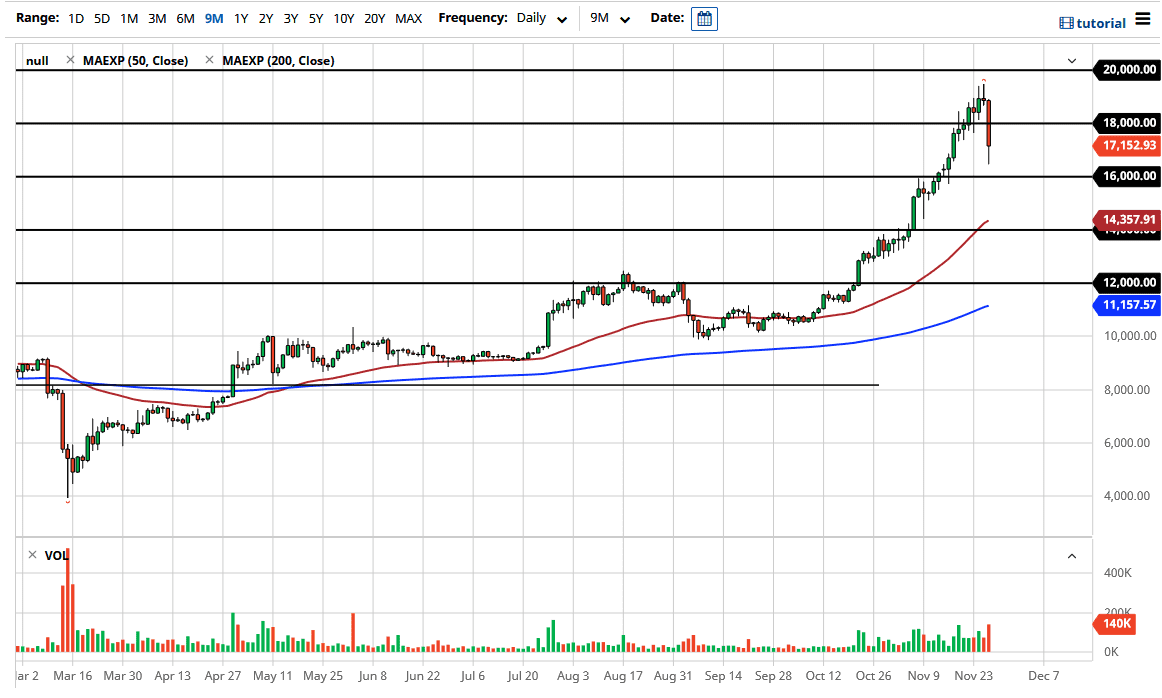 If you been following my analysis here at Daily Forex, you know that I have been warning that something like this was bound to happen. Bitcoin desperately needs some type of pullback to offer any type of value, and this unfortunately is going to be another scenario where people are probably going to get hurt again. The $18,000 level being broken was the first potential support level that has given way. The $16,000 level underneath is the next support level, but after this candlestick, it is very likely that short-term rallies will be sold into, because we should need to see some type of base building in order for people to be comfortable going long again. After this type of move we have seen, it makes sense that people who have seen the value of their assets skyrocket so easily that they would be more than willing to take profits.