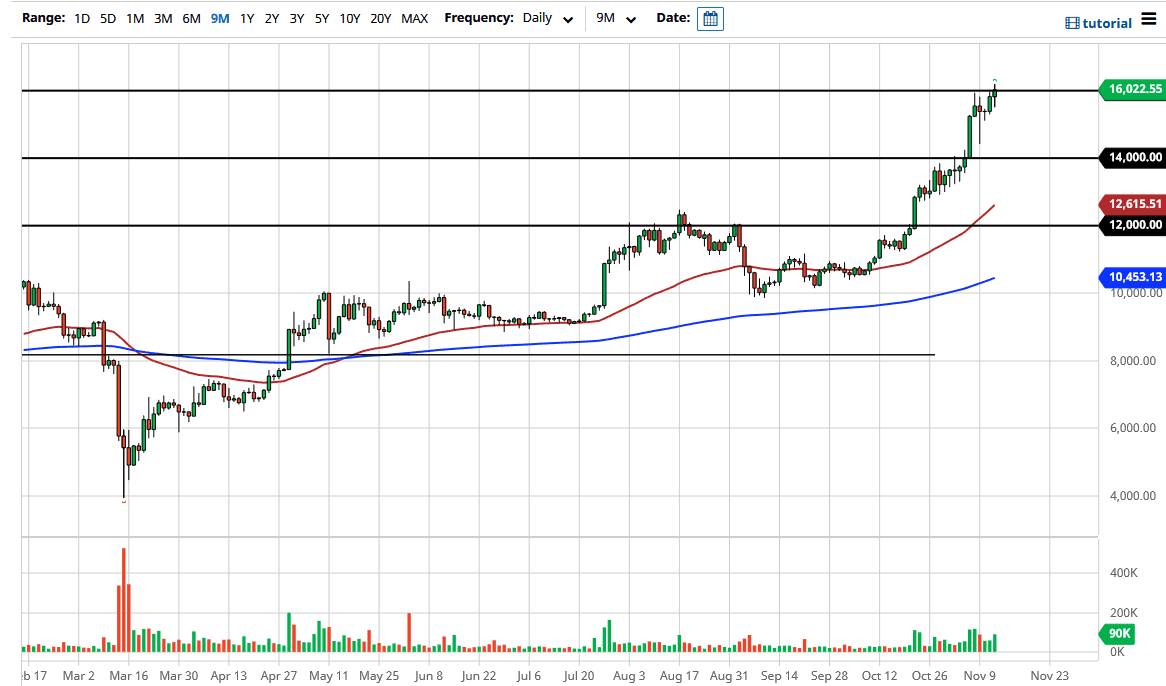 At this point in time, you should be looking at this market as one that you need to find value in, and therefore take advantage of dips as they occur. It certainly looks as if the pressure to the upside is building up yet again, and therefore it is probably only a matter of time before we take off to the upside. If and when we finally do break out and close healthily above the $16,000 level, the market is likely to go looking towards the $17,000 level.