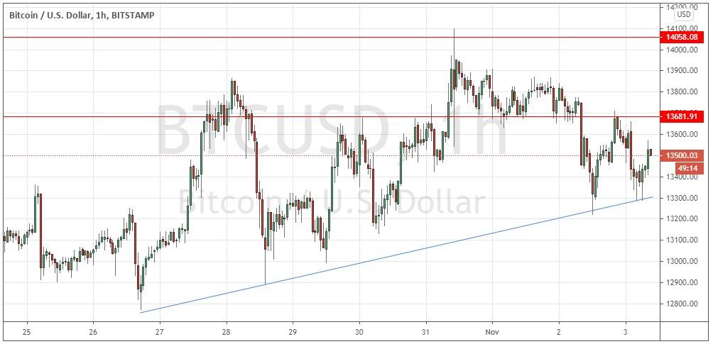 Long entry after a bullish price action reversal on the H1 time frame following the next touch of the bullish trend line shown in the below price chart which is currently sitting at about $13,330.