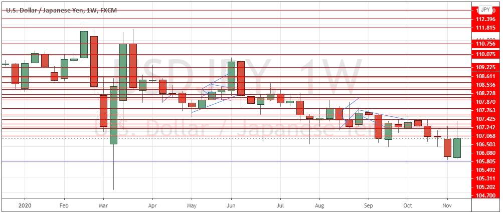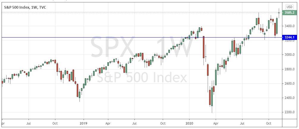 The S&P 500 Index currency pair closed Friday at an all-time weekly high closing price, which is a bullish sign. However, the weekly candlestick is an indecisive doji. Nevertheless, this is a bull market just after a U.S. presidential election, so the price is likely to rise further. I want to see a daily close above 3600 before entering a long trade in this stock Index.