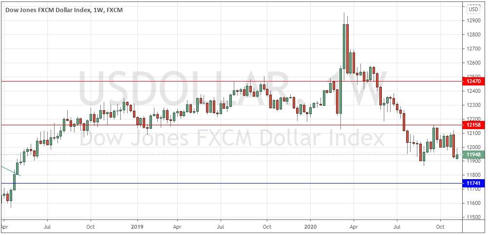 The weekly price chart below shows the U.S. Dollar index printed a small, weakly bullish candlestick. It has a large upper wick, which is a bearish sign. Significantly, the long-term bearish trend has resumed, as the price is lower than it was both 3 and 6 months ago. Overall, next week’s price movement in the U.S. dollar looks likely to be downwards.