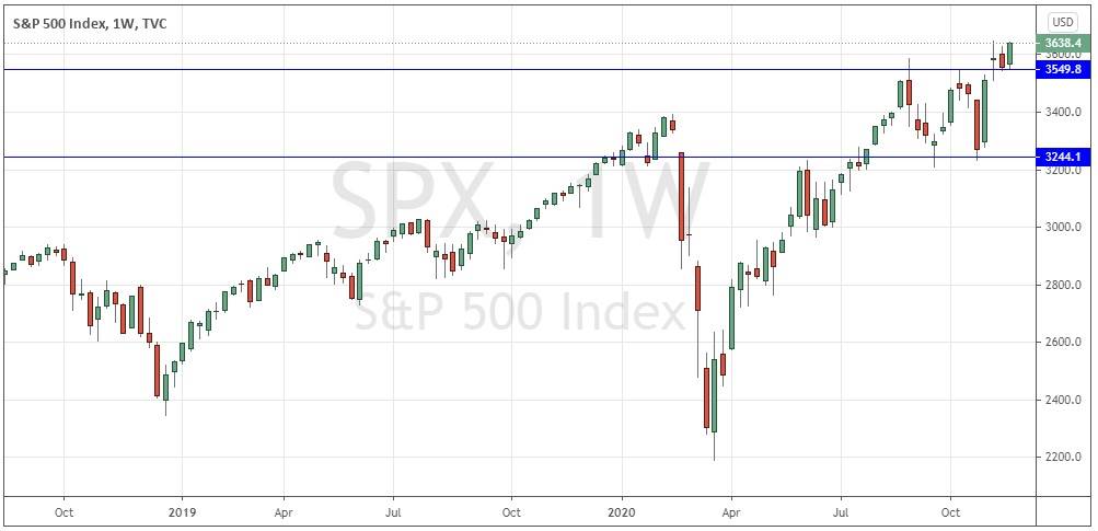 The S&P 500 stock market index just made its highest weekly close of all time, closing right at the high of its weekly range. These are very bullish signs for the most important and biggest global stock market index, suggesting that the price is likely to rise higher still over the coming week. However, bulls should note that the highest all-time price is still a little ahead of the close, after having been made two weeks ago at 3646.