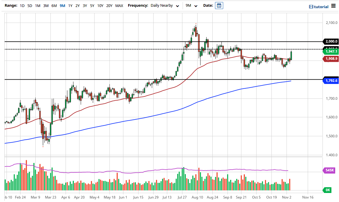 As you can see on the chart, the market reached towards the $1950 level, and now that the Federal Reserve has spoken, there is now going to be a certain amount of focus on the jobs number, and of course the fact that we still have no finalized election results in America. This continues to have people concerned and they may be buying gold for a safety trade. Furthermore, we need to take a look at the overall action when it comes to the greenback.