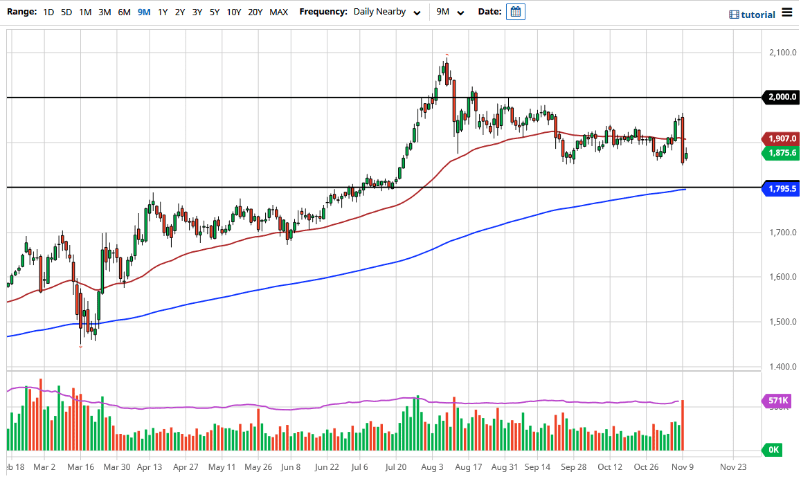 The $1850 level has been supportive in the past, and we are trying to find a turnaround here. However, even if we break down below there, it is likely that the $1800 level will then offer a significant amount of interest, because we had seen a major breakout in this area and it has yet to be tested again. We will eventually see buyers come back into this area and try to keep the uptrend going.